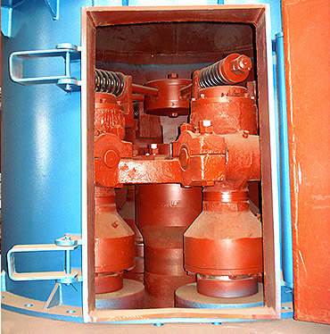 工作時(shí),將需要粉碎的物料從機(jī)罩殼側(cè)面的進(jìn)料斗加入機(jī)內(nèi),依靠懸掛在主機(jī)梅花架上的磨輥裝置,繞著垂直軸線公轉(zhuǎn),同時(shí)本身自轉(zhuǎn),由于旋轉(zhuǎn)時(shí)離心力的作用,磨輥向外擺動(dòng),緊壓于磨環(huán),使鏟刀鏟起物料送到磨輥與磨環(huán)之間,因磨輥的滾動(dòng)碾壓而達(dá)到粉碎物料的目的。