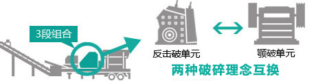 一種車身為4種機型通用,喂料單元互換系統、破碎單元互換系統和篩分單元互換系統,只需再投資單機設備成本,短時間內,即可在同一車身上實現不同型號喂料單元互換系統,反擊破與顎破互換系統,不同型號振動篩互換系統,整機各系統之間的匹配,適應場合更廣泛,破碎功能更強,客戶的消費品得到較大體現。該模塊中配置可選全車載皮帶機。